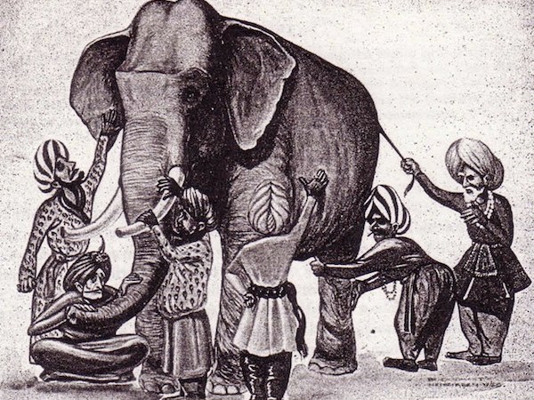 Ils commençaient à discuter, chacun d’eux insistait sur ce qu’il croyait exact. Ils semblaient ne pas s’entendre, lorsqu’un sage, qui passait par-là, les vit. Il s’arrêta et leur demanda » De quoi s’agit-il ? » Ils dirent » Nous ne pouvons pas nous mettre d’accord pour dire à quoi ressemble l’éléphant » Chacun d’eux dit ce qu’il pensait à ce sujet. Le sage leur expliqua, calmement » Vous avez tous dit vrai. La raison pour laquelle ce que chacun de vous affirme est différent, c’est parce que chacun a touché une partie différente de l’animal. Oui, l’éléphant à réellement les traits que vous avez tous décrits «